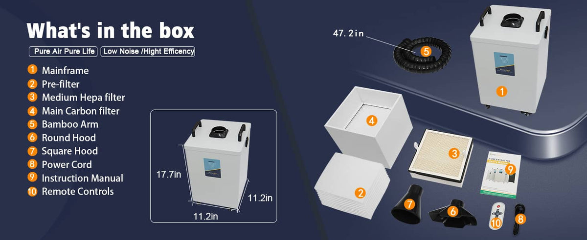 This extractor uses a pre-filter, HEPA filter, and main carbon filter combination to achieve a purification efficiency of up to 99.97% for particles as small as 0.3 microns. The main carbon filter is made from high-iodine coconut shell activated carbon, providing superior adsorption of smoke, odors, and VOCs. Each unit comes with 10 replaceable pre-filters for convenient maintenance.