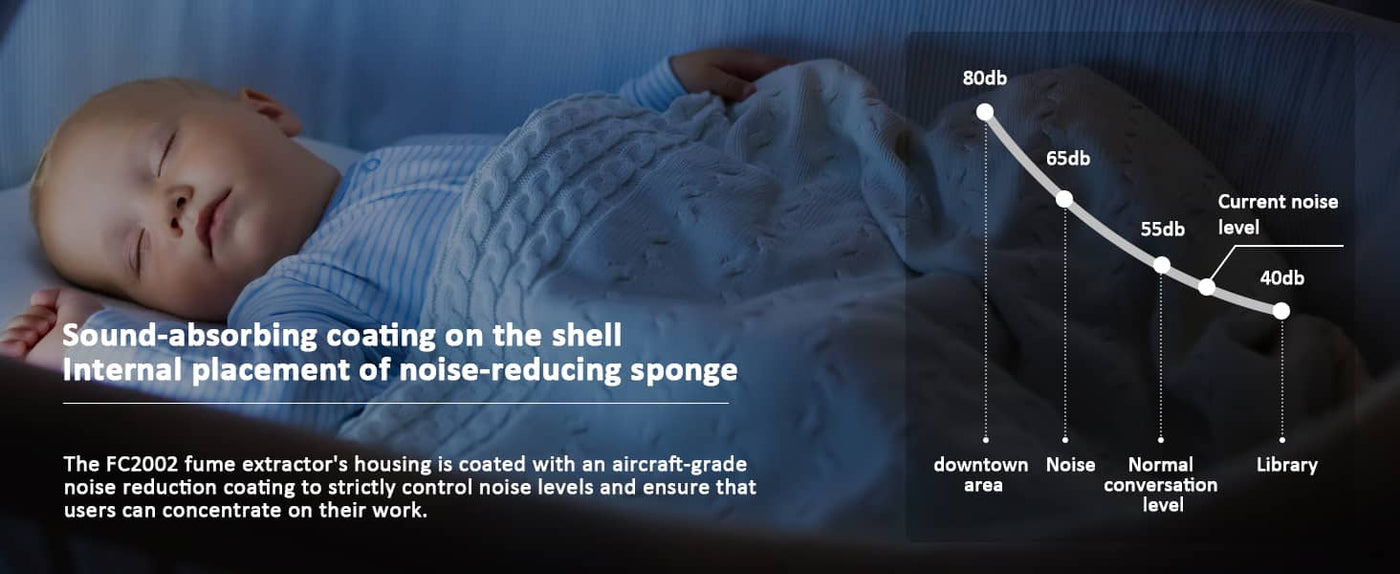 The FC‑2002 is capable of achieving a strong suction power of up to 153 CFM / 260 m³/h, effectively capturing smoke, dust, powders, wood chips, and other particles within a 15 cm range near the hood. Designed for desktop use, it is ideal for electronics repair, soldering benches, small laser engraving and cutting machines, 3D printing stations, and nail salon setups.