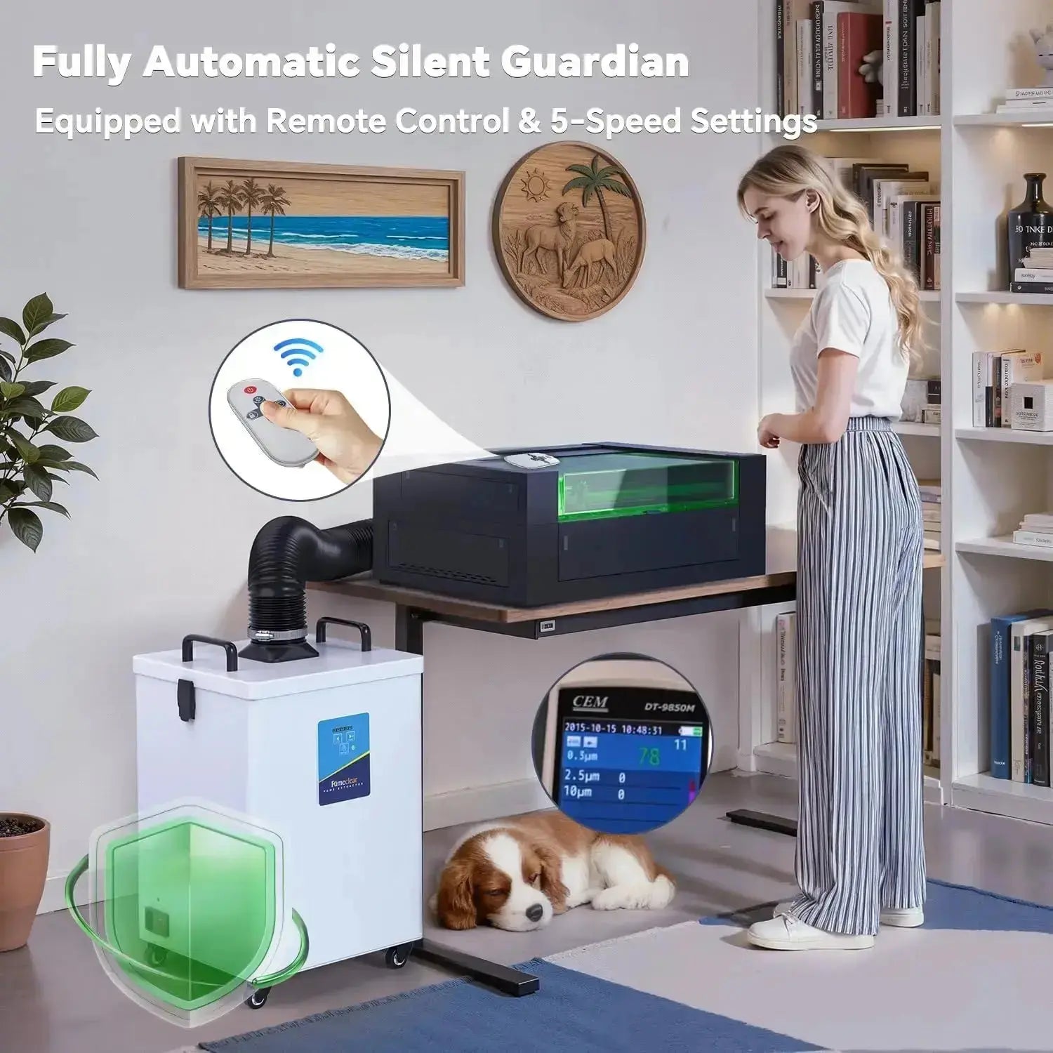 For heavy-smoke materials such as acrylic or MDF deep cutting, we recommend upgrading to FumeClear FC-350 or XL Series, which offer higher airflow and larger activated-carbon filters for dense odor