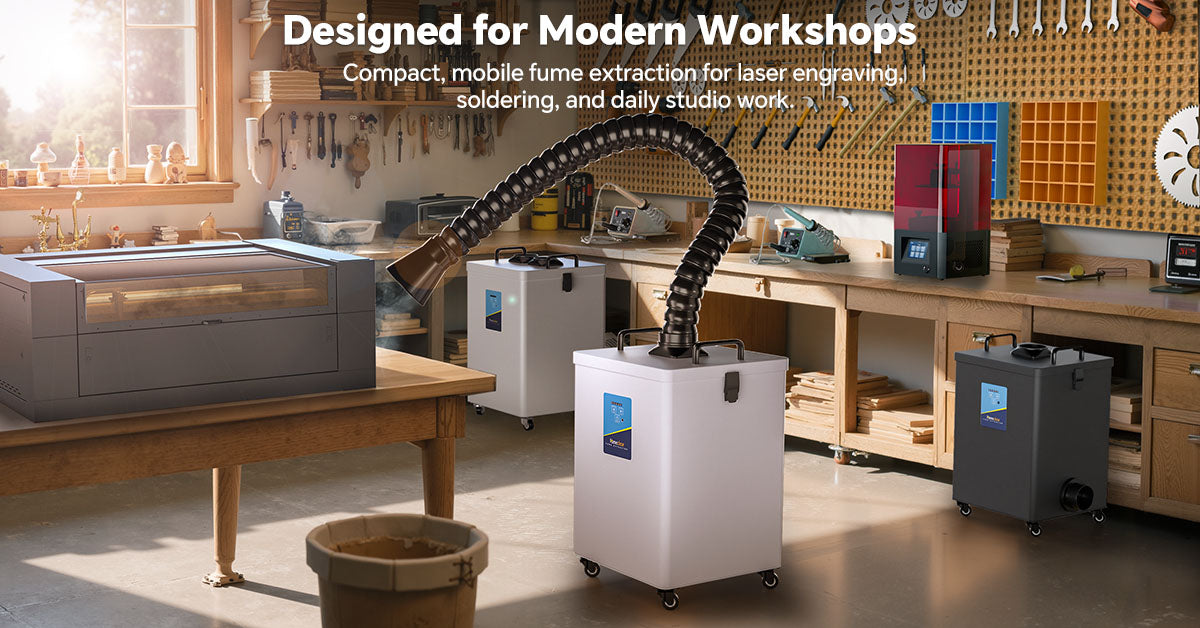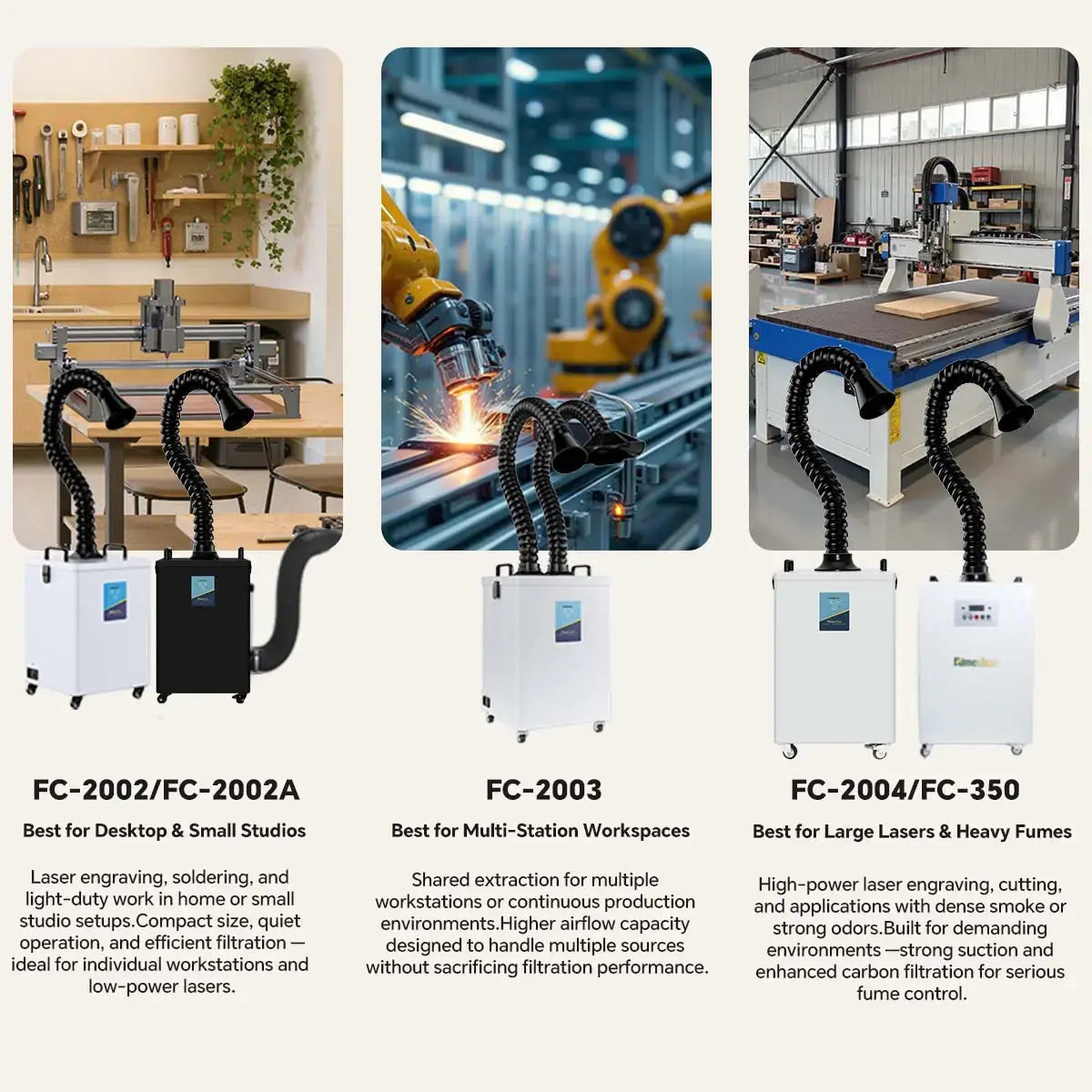 The FC-2002 fume extractor is designed for light-to-medium smoke applications, including laser engravers up to 20 W, soldering, resin 3D printing, and craft workshops.