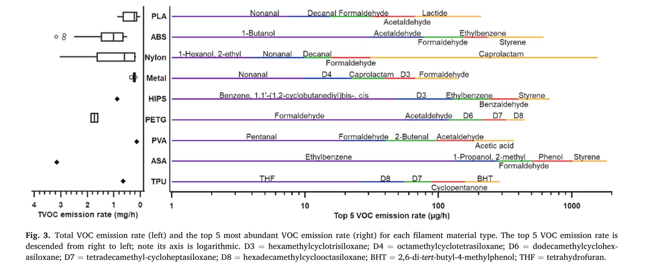 A comprehensive technical report published by UL Chemical Insights analyzed emissions from multiple printer models and filament types. The study identified several VOCs commonly released during printing, including: