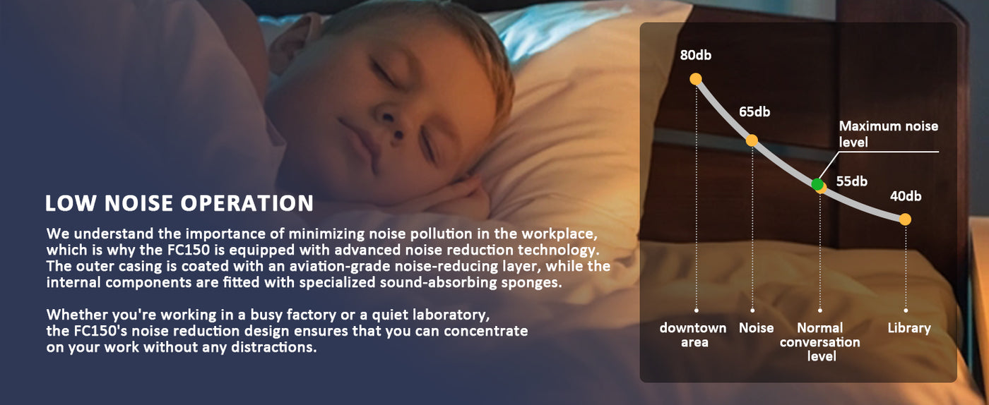 The FC-150 operates at a relatively low noise level, which is just below 63 db. When it is in operation in an office environment, its quietness will not in the least affect people's concentration on work.