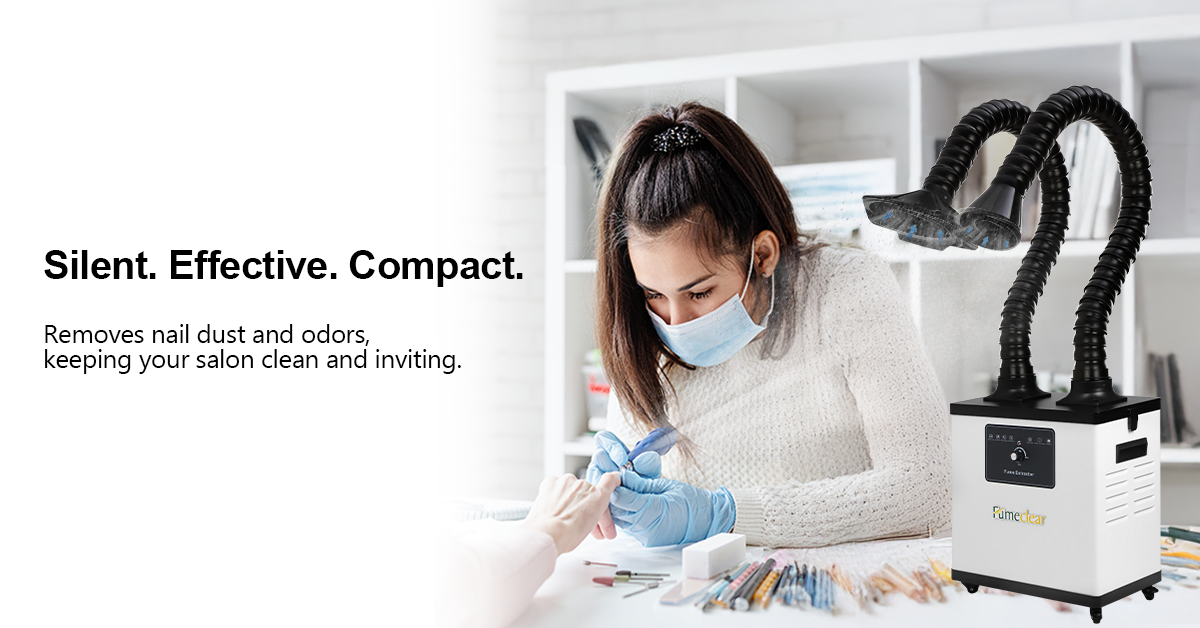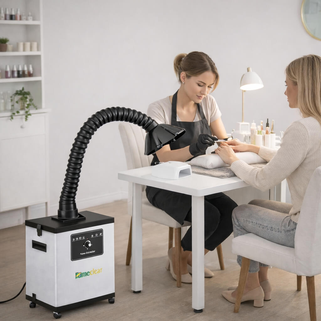 Scientific evidence demonstrates that nail salons frequently expose workers and clients to hazardous VOCs, phthalates, organophosphate esters, and respirable particulate matter — all of which pose acute and chronic health risks. While general ventilation provides some dilution, it is insufficient without localized extraction at the source. Installing a professional fume extractor, such as the Fumeclear® FC‑1001A/1002A, is a crucial step in improving indoor air quality, protecting staff health, and elevating the industry standard for nail salon safety.