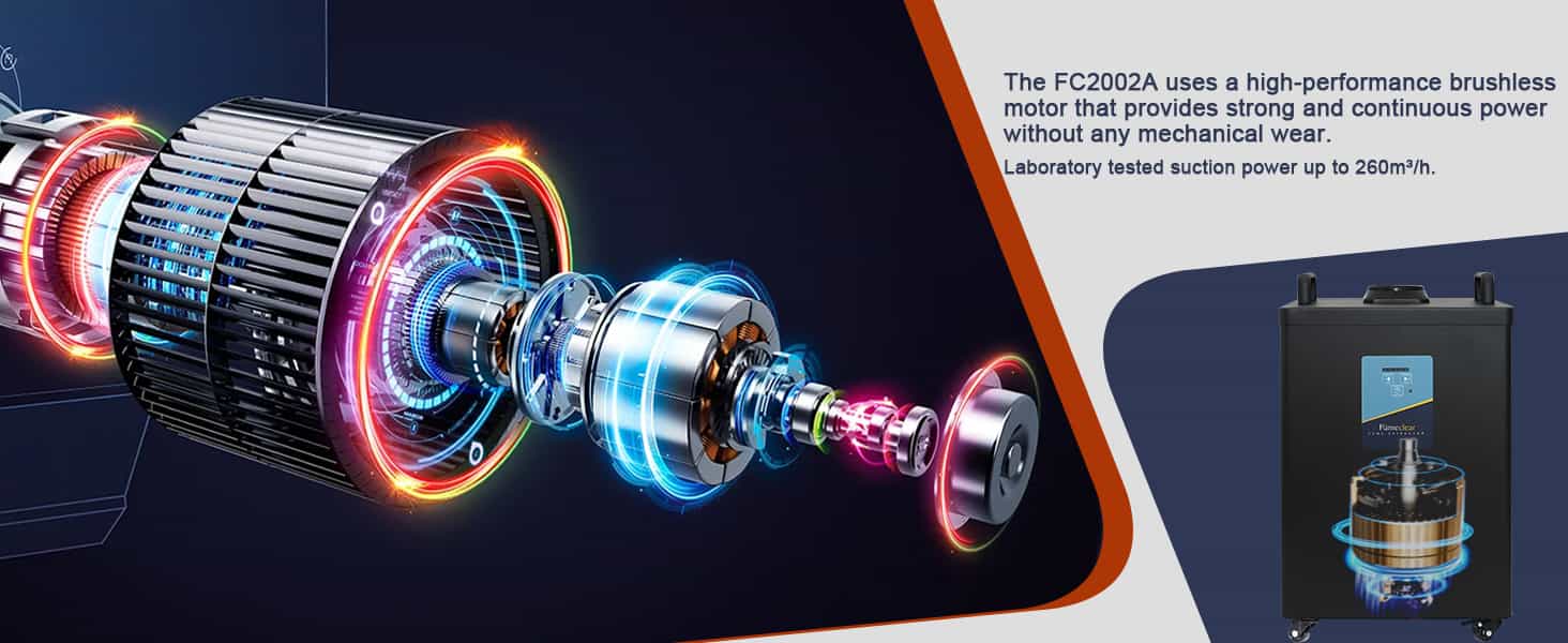 The FC-2002A smoke extractor for 10W to 20W laser engraver is equipped with a high - speed brushless motor. This motor can provide powerful suction for over 20,000 hours without interruption and almost eliminates mechanical wear. Thanks to this design, the device can effectively handle different kinds of debris and dirt. Laboratory tests have verified that its suction power can reach up to 260 m³/h.