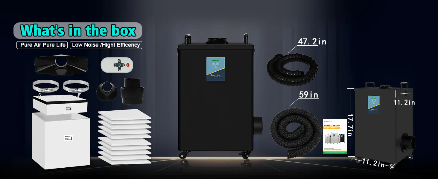 I have had the FumeClear FC-2002A fume extractor for about 5 days now. I wish there were more stars for me to use. It is by far and away the best extractor for my laser. I had two others... they were expensive JUNK that I returned... but this one meets and exceeds all my needs and expectations. My shop use to fill with wood burning smoke now you cannot even tell my laser is cutting. The size is very compact and it does not weigh a ton. It is a little noisy but no more so that the fan on the laser. I have been telling everyone about the quality of the machine and how its made a difference in my shop. I had a little scare.. I have been using it for about 15 hours and it stopped. However with just a quick read of the instructions... I found it to be a blown fuse... which they included and extra.... now... who does that. I was back up and running in minutes. The extractor has great suction and throws out nice clean air. As you can tell I highly recommend this unit for anyone with a laser.