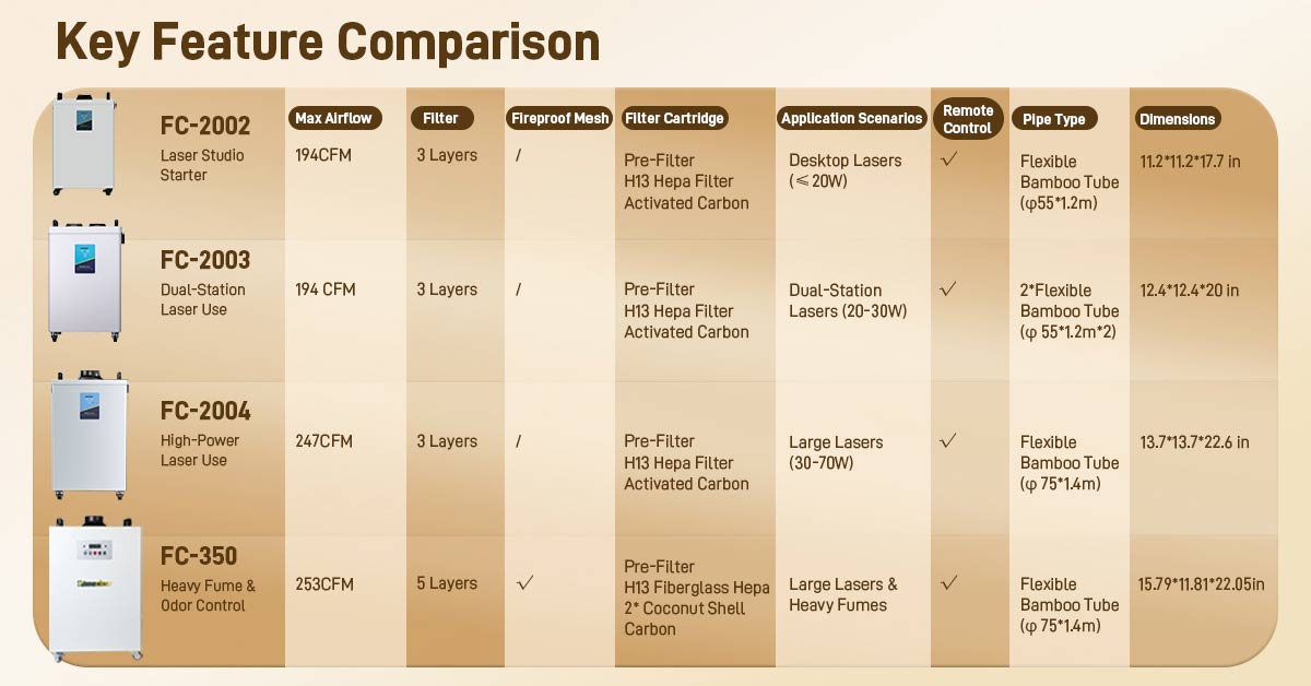 For heavy-smoke materials such as acrylic or MDF deep cutting, we recommend upgrading to FumeClear FC-350 or XL Series, which offer higher airflow and larger activated-carbon filters for dense odor