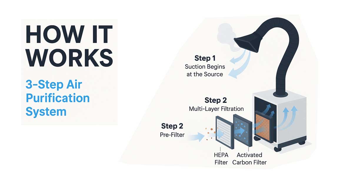 A fume extractor works by capturing harmful air pollutants at the source, then filtering them before they can spread into your environment.