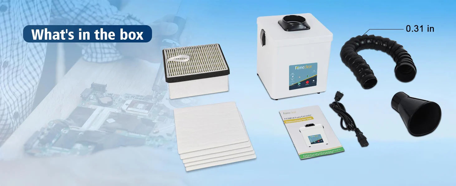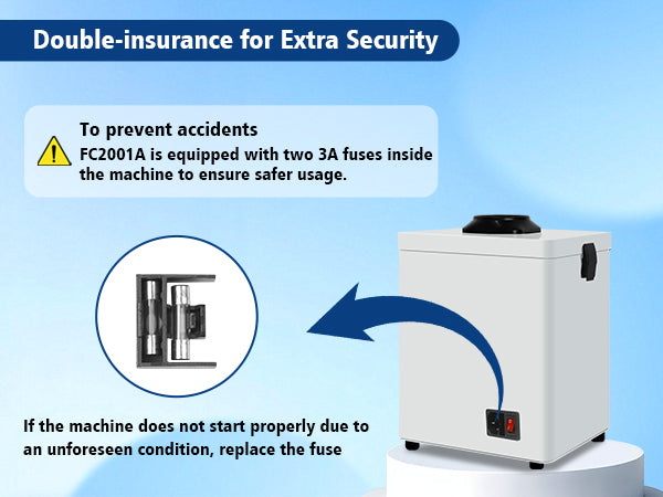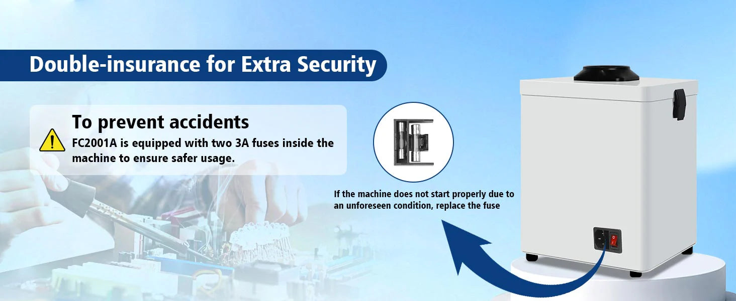 FumeClear FC-2001A solder smoke eater has a maximum CADR up to 120m³/h and supports 3-speed adjustment. It comes with two 3A fuses inside, which not only enhance safety but also offer convenience in case of rare unforeseen circumstances. These fuses are designed for easy replacement if needed, providing an added layer of confidence in the product's reliability and ease of maintenance.