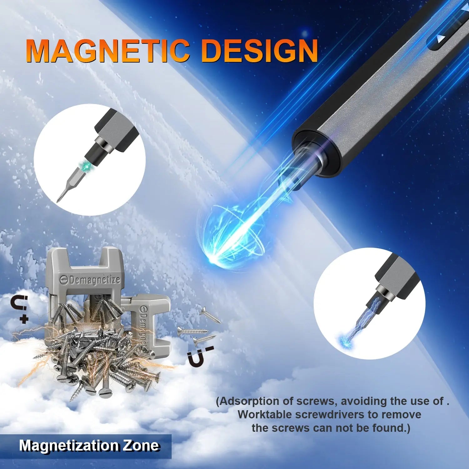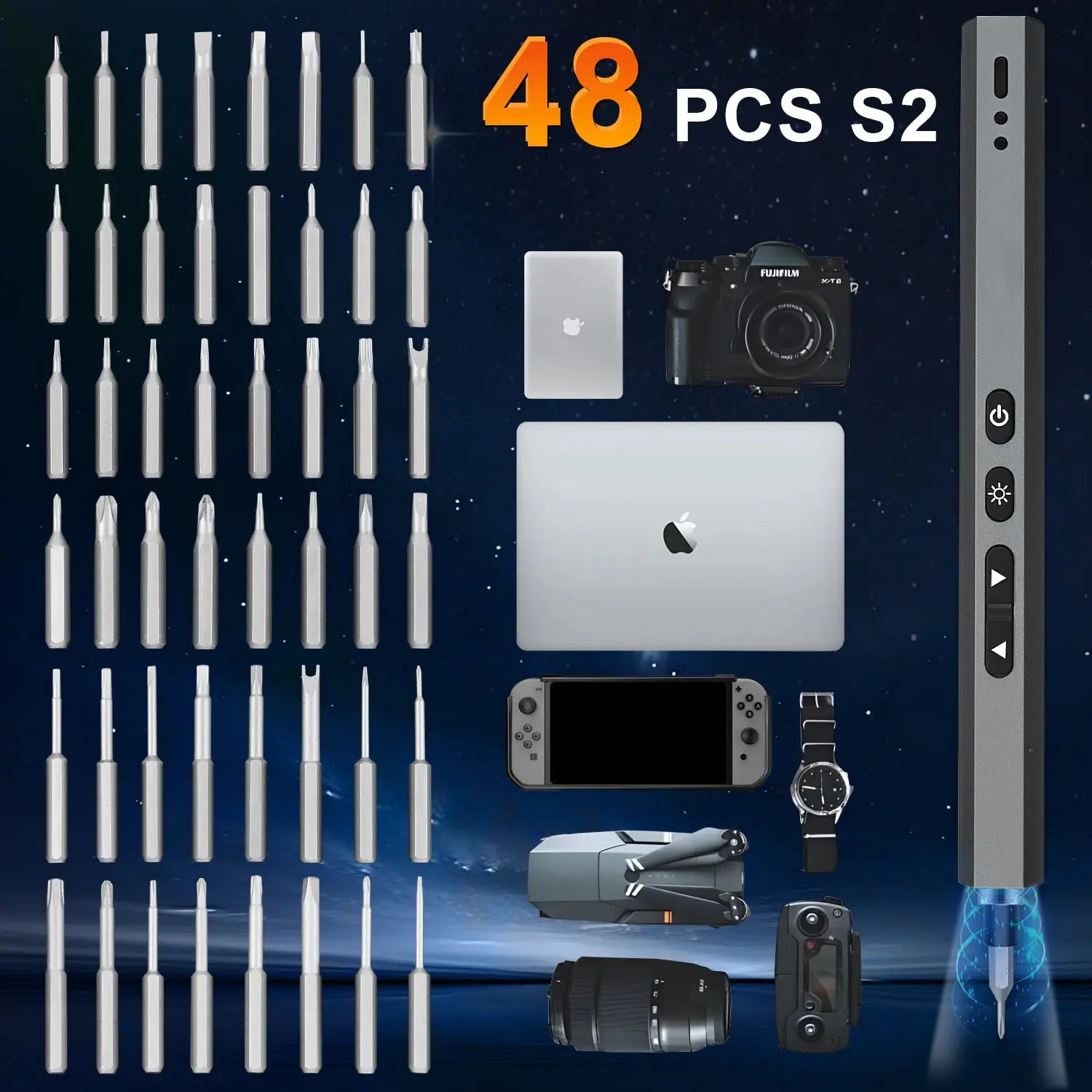 With 48 Mini Screwdriver bits, Torx, Flat Head, Triwing, Hex, Pentalobe, Triangle, etc. 16 long bits are for deep holes. The Electric Screwdriver with magnetic suction meets various scenarios' needs.